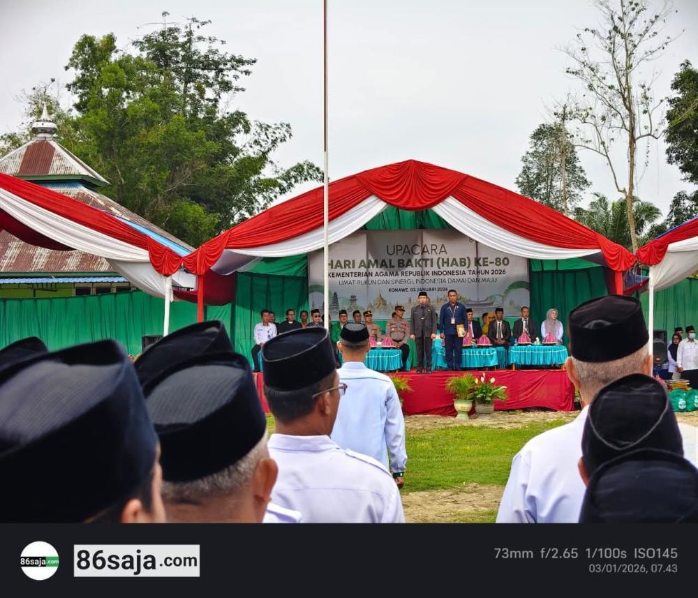86saja.com, KONAWE – Bupati Konawe, H. Yusran Akbar, S.T., melalui Asisten I Setda Konawe, Marjuni Ma’mir, S.P., M.Si, menghadiri acara Hari Amal Bakti ke-80 tahun 2026. Di Pelataran Sekolah Madrasah Aliyah Negeri (MAN) 1 Unaaha, Sabtu (3/1/2026).