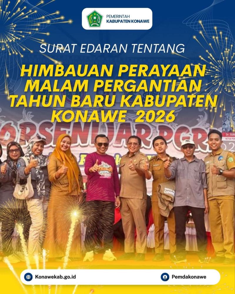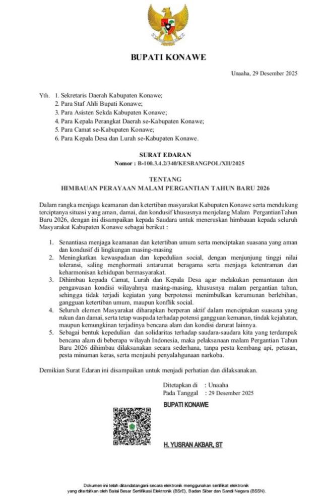 86saja.com, KONAWE – Bupati Konawe, H. Yusran Akbar, S.T., secara resmi mengeluarkan Surat Edaran Nomor: B-100.3.4.2/340/KESBANGPOL/XII/2025 tentang HIMBAUAN PERAYAAN MALAM PERGANTIAN TAHUN BARU 2026.