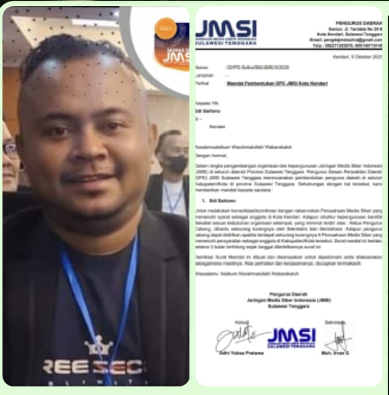Mandat yang diberikan ketua Pengurus Daerah (Pengda) JMSI Sultra Adhi Yaksa Pratama ini setelah melalui rapat kerja pengurus JMSI Sultra yang digelar di Unaaha pada hari Sabtu tanggal 4 Oktober 2025.