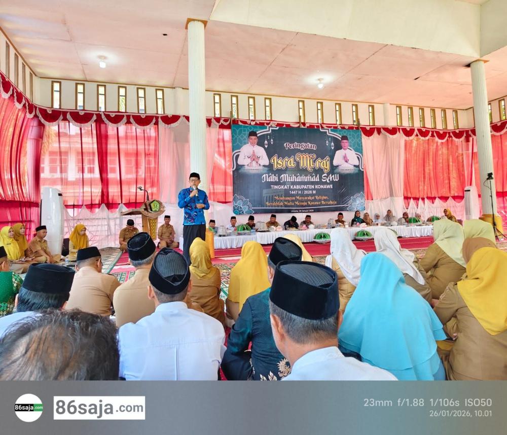 86saja.com, KONAWE – Pemerintah Daerah (Pemda) Kabupaten Konawe adakan kegiatan peringatan hari Isra Mi’raj Nabi Muhammad Shallallahu Alaihi Wasallam yang berlangsung di Pendopo halaman kantor Bupati Konawe, Senin (26/1/2026).